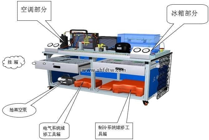 本裝置是根據(jù)制冷類行業(yè)中空調(diào)與冰箱維修技術(shù)的特點(diǎn),針對空調(diào)和冰箱的電氣控制以及制冷系統(tǒng)的安裝與維修進(jìn)行設(shè)計(jì),強(qiáng)化了學(xué)生對空調(diào)冰箱系統(tǒng)管路的安裝、電氣接線、工況調(diào)試、故障診斷與維修等綜合職業(yè)能力。裝置融合了流體力學(xué)、熱力學(xué)、傳熱學(xué)和電氣控制等技術(shù),適合制冷類相關(guān)專業(yè)的教學(xué)和培訓(xùn),也適合制冷類專業(yè)技能競賽.
