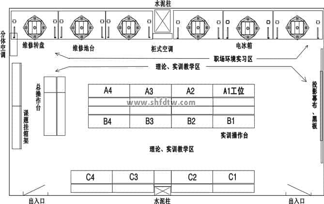 制冷專業(yè)課程實(shí)習(xí)、實(shí)訓(xùn)室(如圖1所示)分“理論、實(shí)訓(xùn)教學(xué)區(qū)”和“職場環(huán)境實(shí)習(xí)教學(xué)區(qū)”兩大區(qū)域。理論、實(shí)訓(xùn)教學(xué)區(qū)域保留傳統(tǒng)的黑板,增設(shè)多媒體投影教學(xué)設(shè)備,實(shí)訓(xùn)操作臺分三組縱向排列,組成24個實(shí)訓(xùn)教學(xué)的操作工位;職場環(huán)境實(shí)習(xí)教學(xué)區(qū)域設(shè)置電冰箱、空調(diào)維修操作地臺,地臺上設(shè)置有360°旋轉(zhuǎn)維修轉(zhuǎn)盤,轉(zhuǎn)盤上放置實(shí)體電冰箱和空調(diào)等制冷設(shè)備,方便學(xué)生實(shí)習(xí)操作。在環(huán)境的分布格局上分區(qū)實(shí)現(xiàn)“理論教學(xué)”、“實(shí)訓(xùn)教學(xué)”和“職場環(huán)境實(shí)習(xí)教學(xué)”的教學(xué)功能,構(gòu)建理論、實(shí)訓(xùn)、實(shí)習(xí)一體化教學(xué)的硬件基礎(chǔ)。