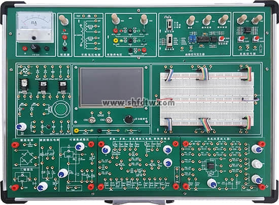 含機箱、工作電源、常用模擬信號源、實驗電路區(qū)和分立元件和測量儀器等