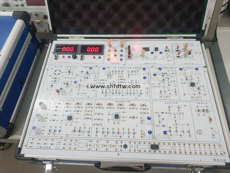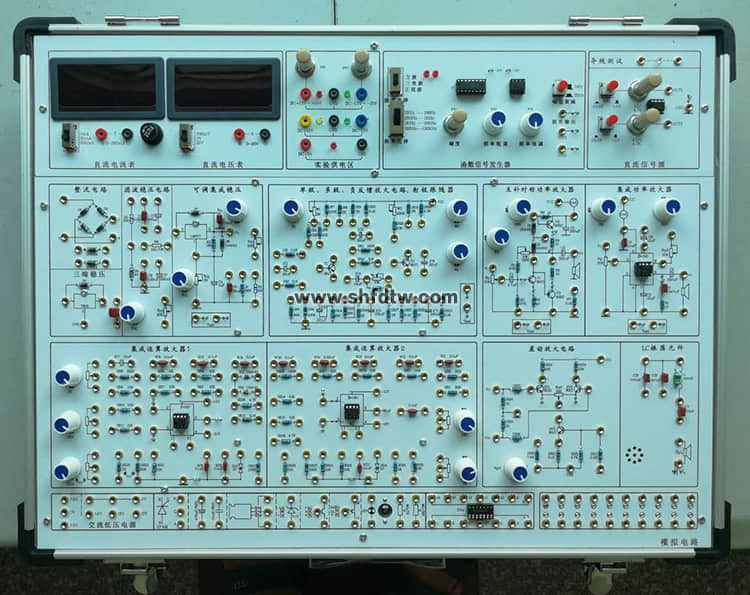 實(shí)驗(yàn)箱由鋁木合金箱體、高性能線性電源、和實(shí)驗(yàn)電路板組成。其中實(shí)驗(yàn)電路采用固定功能模塊方式,電路原理和元器件符號(hào)清晰,實(shí)驗(yàn)用元器件可以焊裝在線路板的反面,安全可靠,不易損壞,也可以裝在線路板的正面,元件直觀可見,感性認(rèn)識(shí)強(qiáng),正面還有實(shí)驗(yàn)電路原理圖,使學(xué)生在實(shí)驗(yàn)時(shí)對(duì)原理一目了然。
