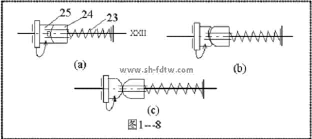 進(jìn)給過(guò)程中,當(dāng)進(jìn)給力過(guò)大或刀架移動(dòng)受到阻礙時(shí),為了避免損壞傳動(dòng)機(jī)構(gòu),在溜板箱中設(shè)置有進(jìn)給的過(guò)載保險(xiǎn)裝置,以便使刀架在過(guò)載時(shí)自動(dòng)停止進(jìn)給。6140型車床溜板箱中的這種過(guò)載保險(xiǎn)裝置,又稱為安全離合器,它的結(jié)構(gòu)如圖1---8。由光桿傳來(lái)的運(yùn)動(dòng)經(jīng)齒輪(Z56)及超越離合器傳至安全離合器的左半部25,然后再通過(guò)螺旋形端面齒傳至離合器的右半部24,離合器右半部24的運(yùn)動(dòng)經(jīng)花鍵傳至軸XXII。在離合器右半部24的后端裝有彈簧23,的壓力,使離合器的右半部24與左半部25相嚙合,克服離合器在傳遞扭矩過(guò)程中所產(chǎn)生的軸向分力。在正常機(jī)動(dòng)進(jìn)給情況下,運(yùn)動(dòng)由超越離合器經(jīng)安全離合器傳至軸XXII(圖a)。當(dāng)出現(xiàn)過(guò)載時(shí),蝸桿軸的扭矩增大并超過(guò)允許值,這時(shí)通過(guò)安全離合器端面螺旋齒傳遞的扭矩也隨之增加,以致使端面螺旋齒處的軸向推力超過(guò)了彈簧23的壓力,于是便將離合器右半部24推開(kāi)(圖b),這時(shí)離合器左半部25繼續(xù)旋轉(zhuǎn),而右半部24卻不能被帶動(dòng),所以在兩者之間產(chǎn)生打滑現(xiàn)象(圖c),將傳動(dòng)鏈斷開(kāi),因此使傳動(dòng)機(jī)構(gòu)不致因過(guò)載而損壞。當(dāng)過(guò)載現(xiàn)象消失后,由于彈簧23的彈力,安全離合器自動(dòng)地恢復(fù)到原來(lái)的正常狀態(tài)。機(jī)床許用的進(jìn)給力決定于彈簧的彈力。擰動(dòng)螺母,調(diào)整桿及止推套的軸向位置,就可調(diào)整彈簧的彈力。