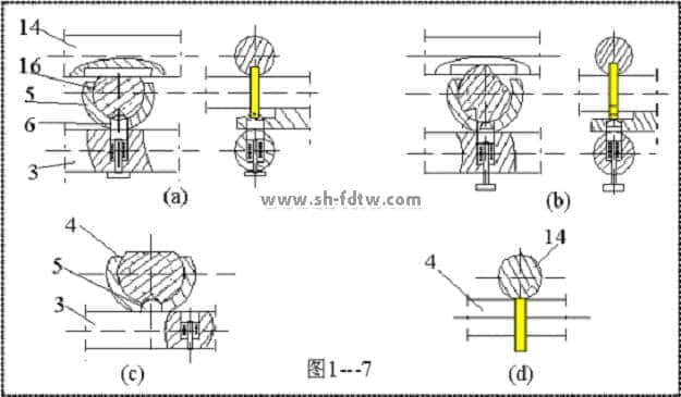為了避免損壞機(jī)床,在接通機(jī)動(dòng)進(jìn)給或快速移動(dòng)時(shí),對(duì)開(kāi)合螺母不應(yīng)合上。反之,合上對(duì)開(kāi)螺母時(shí),就不許接通機(jī)動(dòng)進(jìn)給和快速移動(dòng)。圖1---7是互鎖機(jī)構(gòu)的工作原理圖。圖a是中間位置時(shí)情況,這時(shí)機(jī)動(dòng)進(jìn)給(或快速移動(dòng))末接通,對(duì)開(kāi)螺母也處于脫開(kāi)狀態(tài),所以這時(shí)可任意地接合對(duì)開(kāi)螺母操縱手柄,或進(jìn)給操縱 手柄。圖b是合上對(duì)開(kāi)螺母時(shí)的情況,這時(shí)由于手柄軸4轉(zhuǎn)過(guò)了一個(gè)角度,它的凸肩旋入到軸14的槽中,將軸14卡住,使它不能轉(zhuǎn)動(dòng),同時(shí)凸肩又將銷子5壓入到軸3的孔中,由于銷子5的另一半尚留在固定套16中,所以就將軸3卡住,使它不能軸向移動(dòng) 。由此可見(jiàn),如合上對(duì)開(kāi)螺母,進(jìn)給及快移的操縱手柄1就被鎖住,不能扳動(dòng),因此就能避免同時(shí)接通機(jī)動(dòng)進(jìn)給或快速移動(dòng)。圖1---7c是向左扳動(dòng)進(jìn)給及快移操縱手柄1時(shí)的情況(接通向左的縱向進(jìn)給或快速移動(dòng)),這時(shí)軸3向右移動(dòng),軸3上的圓孔也隨之移開(kāi),銷5被軸3的表面頂住不能往下移動(dòng),于是它的上端就卡在手柄軸4的v形槽中,將手柄軸4鎖住,使對(duì)開(kāi)螺母操縱手柄軸4不能轉(zhuǎn)動(dòng),也就是使對(duì)開(kāi)螺母不能閉合。圖1---7d是進(jìn)給及快移操縱手柄向前扳動(dòng)時(shí)的情況(接通向前的橫向進(jìn)給或快速移動(dòng))。這時(shí),由于軸14轉(zhuǎn)動(dòng),軸14上的長(zhǎng)槽也隨之轉(zhuǎn)開(kāi),于是手柄軸4上的凸肩被軸14頂住,使軸4不能轉(zhuǎn)動(dòng),所以,這時(shí)對(duì)開(kāi)螺母也不能閉合。