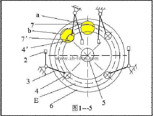 基本組的4個(gè)滑動(dòng)齒輪是由一個(gè)手把集中操縱的。圖1---5是操縱機(jī)構(gòu)簡(jiǎn)圖,基本組的4個(gè)滑動(dòng)齒輪分別由4個(gè)撥塊2來(lái)?yè)軇?dòng),每個(gè)撥塊的位置是由各自的銷子4分別通過(guò)杠桿3來(lái)控制的,四個(gè)銷子4均勻地分布在操縱手輪6背面的環(huán)形槽E中,環(huán)形槽中有兩個(gè)間隔450的孔a和b,孔中分別安裝有帶斜面的壓塊7和7’,其中壓塊7的斜面向外斜,壓塊7’的斜面向里斜。操縱手輪時(shí),先將手輪6向外拉,手輪6轉(zhuǎn)到所需位置后,將手輪重新推入就可以進(jìn)行變速。