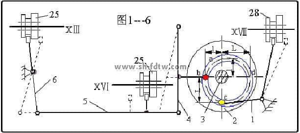 圖1---6是操縱機(jī)構(gòu)簡(jiǎn)圖,其中杠桿4、5、6是操縱移換機(jī)構(gòu)的,圖中是接通公制傳動(dòng)路線時(shí)的情況。杠桿1是操縱軸XⅧ右端滑動(dòng)齒輪Z38的,圖中是接通進(jìn)給時(shí)的情況。杠桿1和4的滾子都裝在凸輪2的偏心圓槽中。此偏心圓槽的a點(diǎn)和b點(diǎn)離開(kāi)回轉(zhuǎn)中心的距離為l,而c點(diǎn)和d點(diǎn)離開(kāi)回轉(zhuǎn)中心的距離則為L(zhǎng)。凸輪2固定在操縱手柄的軸3上。因此,如扳動(dòng)手柄至4個(gè)不同的圓周位置,就可分別按公制或英制傳動(dòng)絲桿或光桿。