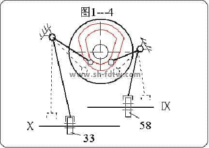 軸Ⅸ及Ⅹ上的滑動(dòng)齒輪各有二個(gè)位置,圖1---4是軸Ⅸ及Ⅹ上滑動(dòng)齒輪的操縱機(jī)構(gòu)簡(jiǎn)圖,在操縱手柄軸上固定有盤形凸輪,轉(zhuǎn)動(dòng)凸輪就可操縱齒輪Z33及Z58,共可得4種不同的傳動(dòng)路線(車削左、右紋,車正常螺距或擴(kuò)大螺距)