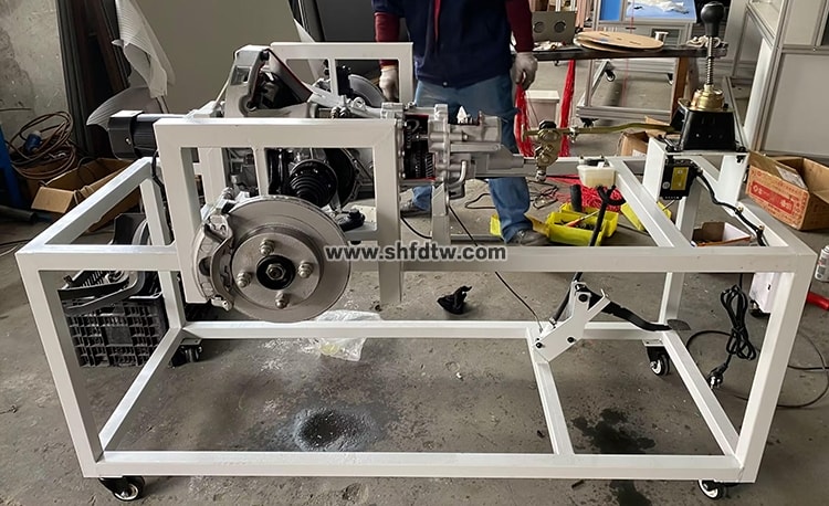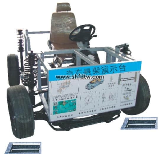 四種不同獨(dú)立懸架系統(tǒng)、交流調(diào)速電動(dòng)機(jī)、凸輪偏心裝置、減震器、輪胎、彩色結(jié)構(gòu)原理圖板、可移動(dòng)式臺架等。