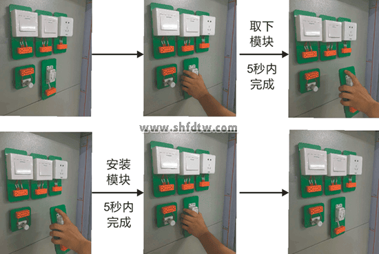 (2)模塊底板(基座)的制作要求:模塊底板采用電木或者聚乙烯等絕緣材料一次成型,要求無(wú)毒、無(wú)味,具有良好塑性;外形設(shè)計(jì)人性化,符合人體工學(xué),具有安全性,其存取、放置、移動(dòng)的過(guò)程中應(yīng)可實(shí)現(xiàn)安全、舒適、自然的操作;模塊底板必須具備重復(fù)利用的特性,同一孔位通過(guò)M3或M4自攻螺絲安裝、更換接線端子排30次以上,模塊底板上的螺絲底孔依然不滑牙、松壞,且底板不變形。