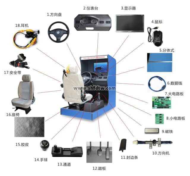 1. 鋼架聚氨酯實(shí)車方向盤 2. 塑料材質(zhì)儀表工作臺(tái) 3. LED液晶顯示器 4. 光電鼠標(biāo)