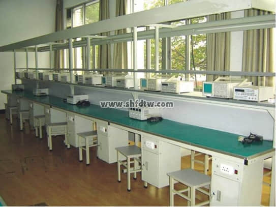 c、線體每兩工位配40W日光燈照明一套,每工位配四位工位插座一只(其中2為為二腳,2位為三腳),帶烙鐵筒帶插座工具箱一只(工具箱尺寸為寬300mm,高400mm,深220mm),工藝圖板一套(A3無色透明,2塊); d、臺面采用厚18mm雙面貼塑板制作,上鋪綠色防靜電橡皮,槽鋁包邊;