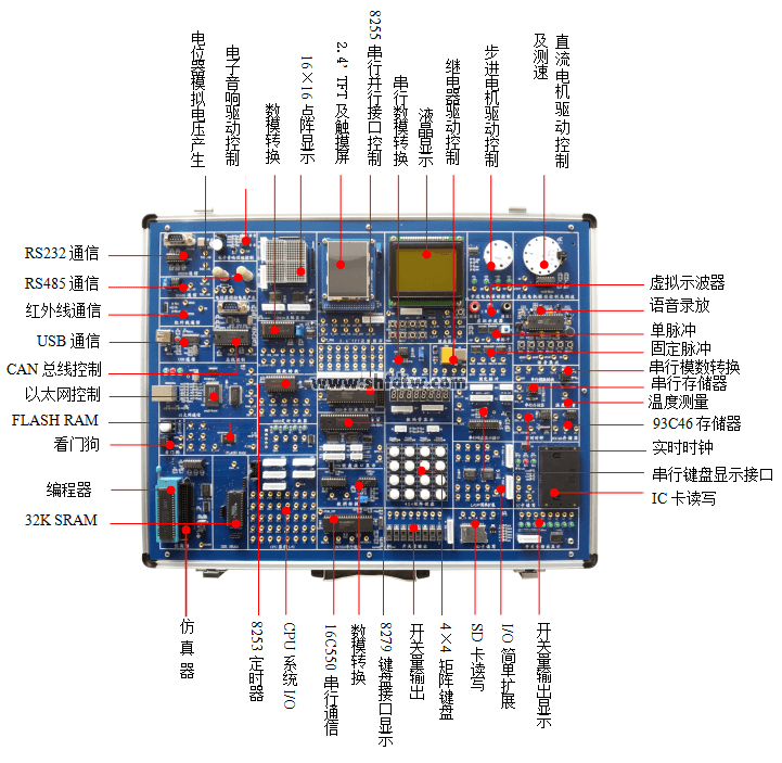 1)配置全功能51單片機(jī)仿真系統(tǒng),RS232/USB通信方式,不占用微控制器軟硬件資源;CPU的口線全開放;