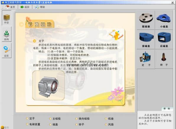 (6)電機(jī)與變壓器:主要講解了三相異步電動(dòng)機(jī)、單相異步電動(dòng)機(jī)、伺服電機(jī)、步進(jìn)電機(jī)、直流電機(jī)與變壓器的外型、結(jié)構(gòu)、裝配與維修等知識(shí)。