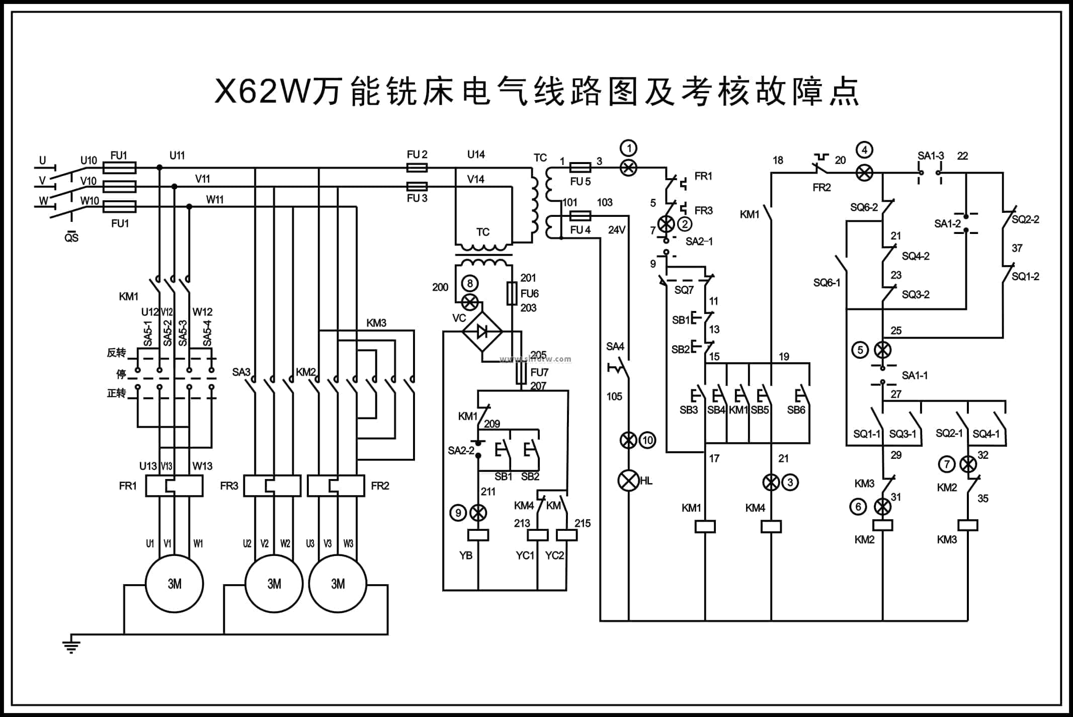 X62W萬(wàn)能銑床電氣線(xiàn)路圖及考核故障點(diǎn)
