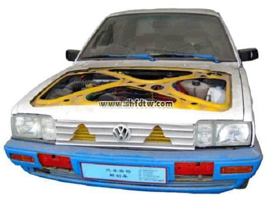 桑塔納整車解剖模型選用桑塔納3000為基礎(chǔ),可容易地看見(jiàn)發(fā)動(dòng)機(jī)艙、車身側(cè)圍的構(gòu)造結(jié)構(gòu)、鋼板的厚度及獨(dú)立懸掛的結(jié)構(gòu),甚至車輪的輪轂及輪胎的橫截面。此外,車內(nèi)方向盤(pán)、排擋桿、手剎、安全帶固定裝置及安全帶卷等平時(shí)都被包裹嚴(yán)實(shí)的部件也被特別地一剖為二,內(nèi)部工藝精度、構(gòu)造清晰呈現(xiàn),能夠展示汽車各總成裝置以及各附件位置。