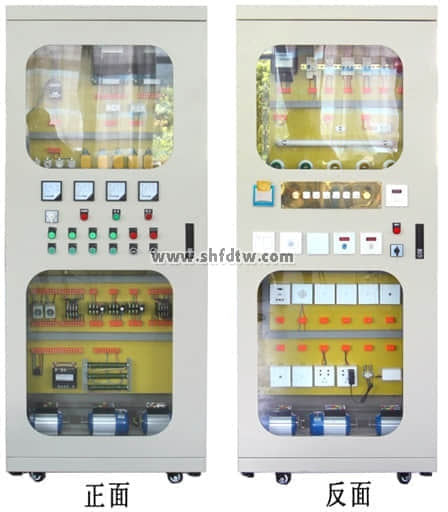 1、本裝置采用正反二面開門的離墻式威圖電氣控制柜,且正反面同時(shí)都可以操作,柜體中寬度能保證兩個(gè)學(xué)生同時(shí)合作接線實(shí)訓(xùn)的需要,其外形尺寸寬×厚×高分別為:800×600×2000 mm。柜體采用厚度為國(guó)標(biāo)1.5以上的優(yōu)質(zhì)鋼板,柜門采用厚度為國(guó)標(biāo)2.0以上的優(yōu)質(zhì)鋼板并安裝四塊大的玻璃,學(xué)生能通過玻璃看清柜內(nèi)各元器件及相應(yīng)的動(dòng)作,金屬表面噴塑,柜體中間有二塊優(yōu)質(zhì)環(huán)氧樹脂絕緣板和相應(yīng)的支架系統(tǒng)隔離正反兩個(gè)柜體,安裝板上安裝智能建筑電氣控制線路各實(shí)訓(xùn)考核模塊。各元器件所有的接線端都連接至相應(yīng)的專用實(shí)訓(xùn)接線端子上,每個(gè)接線端上都套有用電腦打印接線端名稱及編號(hào)的套管,并且更換方便。被控制電機(jī)安裝于電氣控制柜內(nèi)。