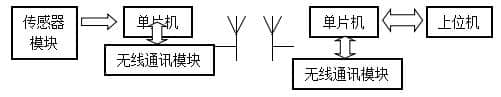 無(wú)線通訊傳感網(wǎng)主要由以下幾部分組成:AD轉(zhuǎn)換、發(fā)射部分、接收部分、上位機(jī)。系統(tǒng)結(jié)構(gòu)圖如下圖所示。