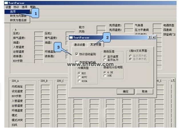 文本顯示界面:可測(cè)試壓縮機(jī)的運(yùn)轉(zhuǎn)頻率,傳感器的各種數(shù)據(jù),電子膨脹閥的工作步數(shù)等幾十種中央空調(diào)的工作數(shù)據(jù)和狀態(tài),