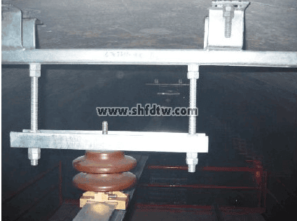 技術(shù)參數(shù):接觸網(wǎng)安裝不設(shè)支柱,采用垂直懸吊的方式,固定在隧道頂或房頂上。該裝置不需要考慮耐熱、耐水、抗震等性能,因此不采用化學(xué)錨栓,使用膨脹螺釘固定,確保牢固。安裝三處底座,跨距5米。匯流排采用π形截面的鋁合金擠制型材,標(biāo)稱截面2213mm2。一根匯流排的標(biāo)準(zhǔn)長(zhǎng)度是12m,該場(chǎng)地16m,需一個(gè)中間接頭。接觸線采用CTAH-120mm2,長(zhǎng)16m。敷設(shè)16m長(zhǎng)架空地線,采用不小于50 mm2的銅絞線。