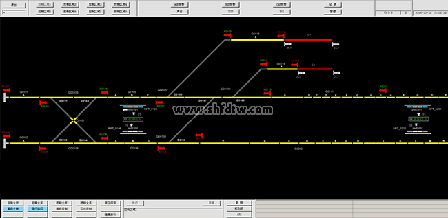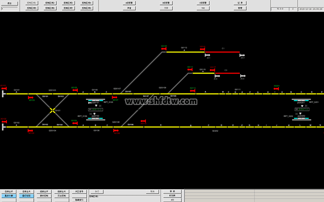 車輛段聯(lián)鎖仿真上位機(jī)是車輛段聯(lián)鎖設(shè)備的人機(jī)接口部分,主要功能是將車輛段站場圖形、設(shè)備狀態(tài)、進(jìn)路狀態(tài)、操作結(jié)果等內(nèi)容在顯示在界面上。同時可訓(xùn)練車輛段聯(lián)鎖系統(tǒng)操作員或調(diào)度人員根據(jù)真實作業(yè)情況完成車輛段列車、調(diào)車進(jìn)路辦理、進(jìn)路取消、單獨操縱道岔、單獨鎖閉道岔、封鎖信號機(jī)、軌道區(qū)段封鎖、清封、引導(dǎo)接車等操作。車輛段聯(lián)鎖仿真上位機(jī)界面如下圖所示。