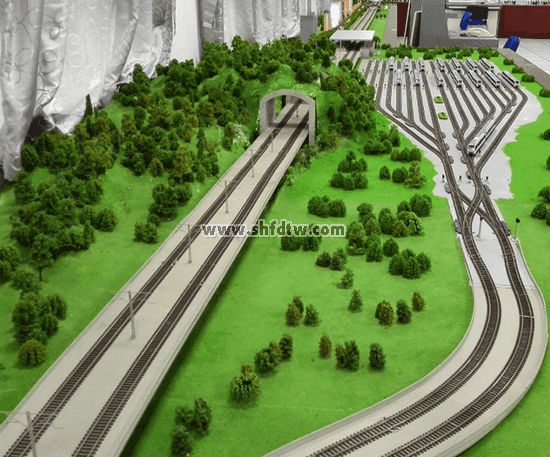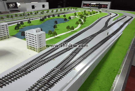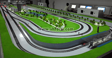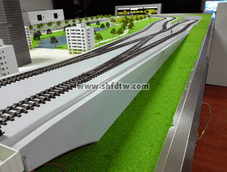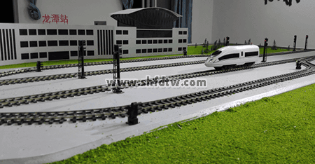 沙盤軌道線路采用仿真工字型軌道模型,表面經(jīng)過防氧化處理,美觀整潔、維護(hù)方便。軌道安放在沙盤臺面的整體道床模型上,貼合平整,轉(zhuǎn)彎曲線半徑設(shè)置合理,確保列車穩(wěn)定運行。