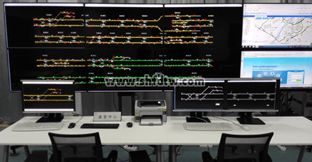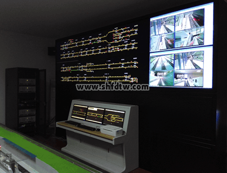 大屏顯示內(nèi)容的排列方式、視屏信號源可以隨時在線修改,用戶可以根據(jù)實際應(yīng)用需要,調(diào)整每一塊屏幕的顯示內(nèi)容。例如可將將綜合監(jiān)控、視屏監(jiān)控等其他信號投入大屏內(nèi),與信號系統(tǒng)一同顯示。拼接調(diào)試完成的調(diào)度實訓(xùn)中心綜合顯示大屏如下圖所示。