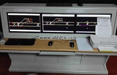 調(diào)度員培訓(xùn)工作站HMI可以讓學(xué)員實際操作ATS人機(jī)界面,實現(xiàn)站場和列車數(shù)據(jù)的顯示,完成人工進(jìn)路設(shè)置、部分或全部信號機(jī)自排全開/自排全關(guān)、追蹤全開/追蹤全關(guān)、單獨操作或鎖閉軌旁信號設(shè)備、車次號操作、控制權(quán)的交接、設(shè)置緊急停車、扣車、跳停指令、聯(lián)鎖相關(guān)的道岔單操、道岔單鎖、關(guān)閉信號、重新開放信號、封鎖(單個或全區(qū))信號、區(qū)段封鎖等功能。學(xué)員也可分析和處理工作站上出現(xiàn)的相關(guān)事件信息和故障報警信息。調(diào)度員工作站臺面及HMI的界面如下圖所示。