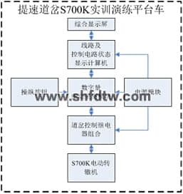 提速道岔S700K實訓演練平臺通過道岔操縱按鈕接通道岔控制電路,控制S700K轉轍機的定、反位的動作。在接通道岔啟動電路時、轉轍機轉換到相應的位置并給出定/反位表示表示后,在綜合顯示屏上顯示繼電器線圈和接點狀態(tài),并連通相應的表示電路,點亮對應的表示燈。當轉轍機不到位或故障時,給出相應提示。此練功平臺能使學員在較小的室內空間內達到身臨其境的感覺。同時通過道岔控制電路的實時顯示,直觀的反映電路的動作情況,從而達到常規(guī)現(xiàn)場教學無法達到的效果。平臺各部件間接口如下圖所示: