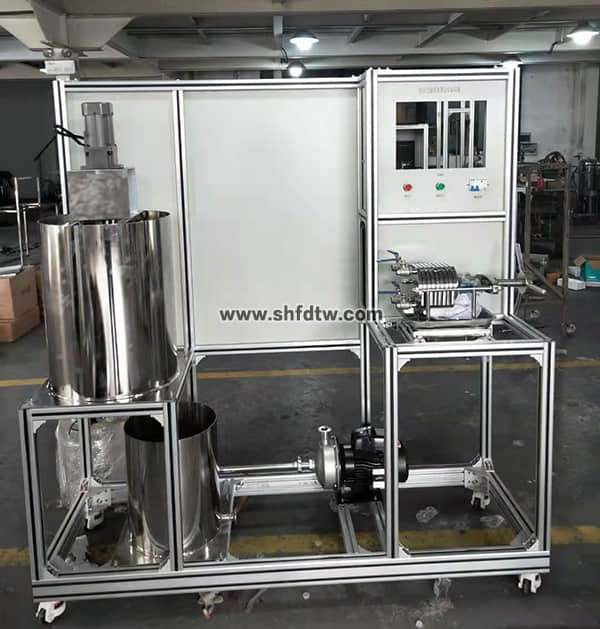 4、該實驗裝置是由過濾板、過濾框組成的小型工業(yè)用不銹鋼板框過濾機(jī),能完整地體現(xiàn)了板框壓濾機(jī)的構(gòu)造和操作流程,采用高壓漿料泵將物料注入過濾機(jī),工程化概念強。