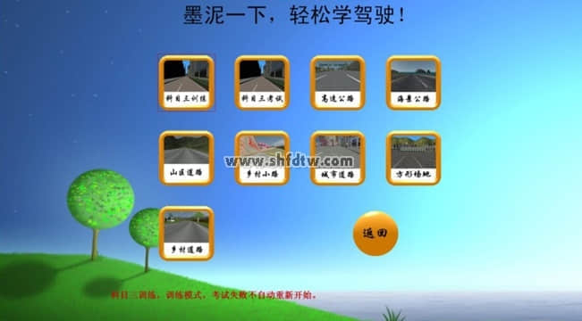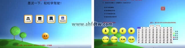主界面中間是一輛在轉(zhuǎn)盤上旋轉(zhuǎn)的車輛,該車輛為當(dāng)前選擇進(jìn)行訓(xùn)練的車輛(可以是捷達(dá)、東風(fēng)、拖車等等)。圍繞車輛和轉(zhuǎn)盤,共有12個(gè)按鈕,分別是:理論知識(shí)(包含科目一和安全文明駕駛考試)、場(chǎng)地訓(xùn)練(科目二)、道路訓(xùn)練(科目三)、天氣設(shè)置、軟件設(shè)置、時(shí)間設(shè)置、退出系統(tǒng)、被動(dòng)駕駛、交通標(biāo)志、駕駛回放、車型選擇和原地駕駛。