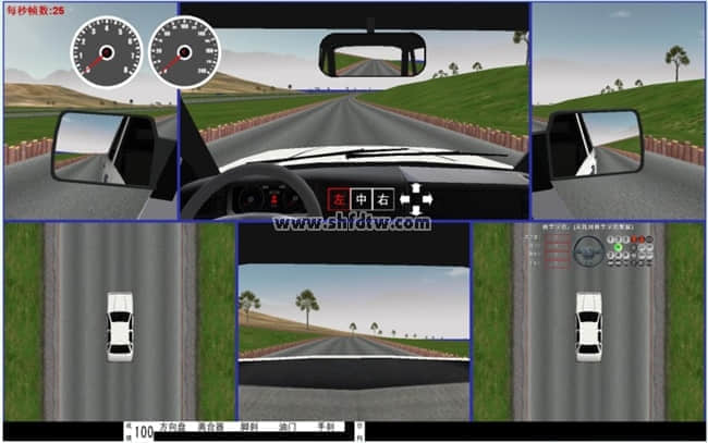 在科目三道路駕駛訓(xùn)練中,進(jìn)入場(chǎng)景后,默認(rèn)為6視窗訓(xùn)練模式,左上視圖為局部放大的左后視鏡窗口,中上視圖為前視圖,右上視圖為右后視鏡窗口,左下視圖為俯視,中下視圖為后車窗,右下視圖為教學(xué)示范窗口(如果新學(xué)員不熟悉科目三道路駕駛考試規(guī)則,可以先觀摩教學(xué)示范后再進(jìn)行訓(xùn)練)。
