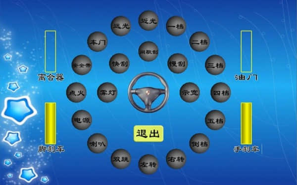 座艙包含了與真實(shí)車(chē)輛相同的操作部件,“五大”操縱機(jī)構(gòu):方向盤(pán)、離合器,腳剎,油門(mén)和手剎。真車(chē)變速器:倒檔、一檔、二檔、三檔、四檔、五檔和空擋(自動(dòng)檔只含前進(jìn)檔、倒車(chē)檔和駐車(chē)檔)。真車(chē)操作開(kāi)關(guān):左轉(zhuǎn)向燈、右轉(zhuǎn)向燈、應(yīng)急燈、喇叭、點(diǎn)火開(kāi)關(guān)、總電開(kāi)關(guān)、安全帶、車(chē)門(mén)、雨刷、遠(yuǎn)光燈、近光燈、遠(yuǎn)近光交替。