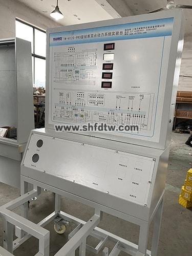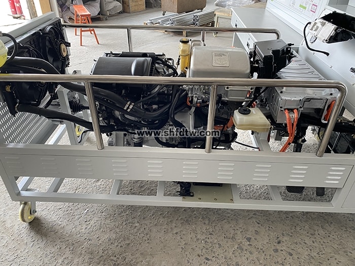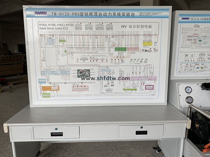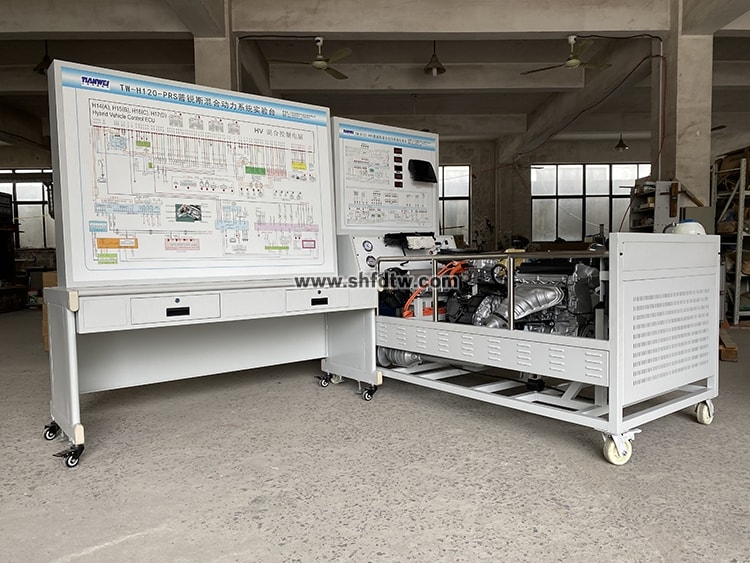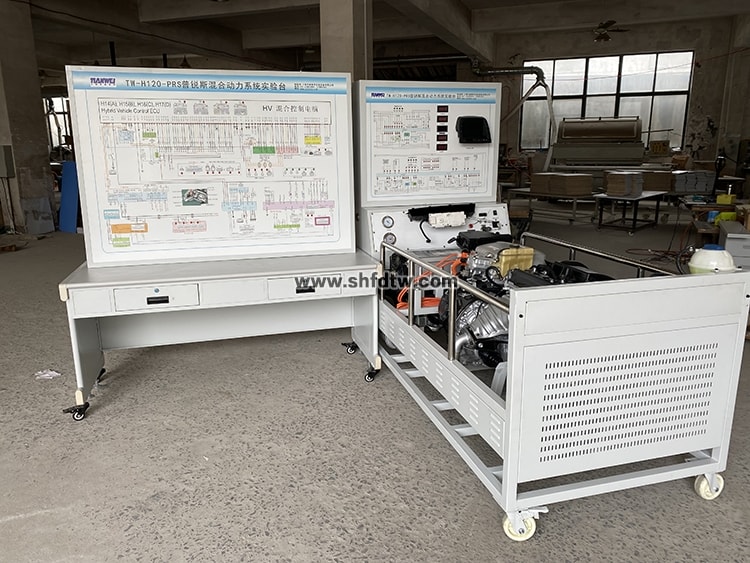 發(fā)動機總成和發(fā)動機控制單元、變速器、M1,M2電機、HV蓄電池、儀表總成、冷卻液溫度傳感器、進氣溫度傳感器、節(jié)氣門控制總成、空氣質(zhì)量計、氧傳感器、點火開關(guān)、整套散熱機構(gòu)、汽油箱和汽油泵總成、蓄電池、五個數(shù)字電壓表、真空壓力表及燃油壓力表、帶有完整彩色電路原理圖面板、外接式檢測端子、智能故障設(shè)置盒總成、可移動臺架、使用說明書及實驗指導(dǎo)書等。