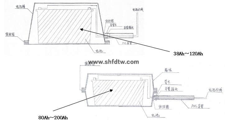 7、4、不同的蓄電池應(yīng)配不同型號的ABS塑料箱,以下是安裝示意圖。