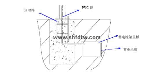 2、4、地基預(yù)埋件放入地基澆筑坑的中間,將PVC塑料管的一端放在蓄電池箱內(nèi),在將PVC塑料管的另一端放在基礎(chǔ)結(jié)構(gòu)件固定底版中心穿出0.2米。一切準(zhǔn)備就緒,用C20混凝土澆灌后用震動棒震動即可。