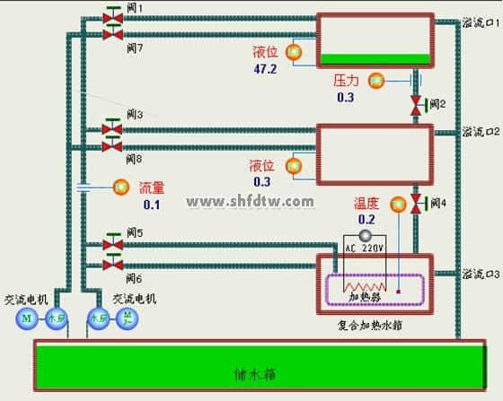 控制對(duì)象的模型由上、中、下三個(gè)水箱及一個(gè)儲(chǔ)水箱組成,上、中、下水箱由兩臺(tái)磁力泵供水。上、中兩個(gè)水箱各裝有一個(gè)擴(kuò)散硅壓力變送器來(lái)檢測(cè)壓力和液位;下水箱是一個(gè)復(fù)合式水箱,其中內(nèi)筒不銹鋼水箱中裝有500W電加熱器和PT100溫度傳感器。主管道上裝有小型渦輪流量計(jì)(定做)、小型閥門和兩臺(tái)磁力驅(qū)動(dòng)泵。水箱中的水位、壓力、水溫以及供水的流量都可以用于構(gòu)成控制系統(tǒng)的被控參量。兩臺(tái)磁力泵中的任一臺(tái)都可作為調(diào)節(jié)通道或干擾通道,模擬現(xiàn)場(chǎng)產(chǎn)生的干擾信號(hào),以驗(yàn)證系統(tǒng)的穩(wěn)定性和抗干擾性能。
