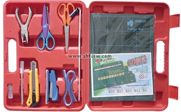 配備清單:切割墊板1塊、剪刀1把、直尺1把、花邊剪1把、打孔器1個(gè)、蛇形尺1個(gè)、美工刀1把、筆刀1把(含筆刀刀片3片)、訂書機(jī)1個(gè)