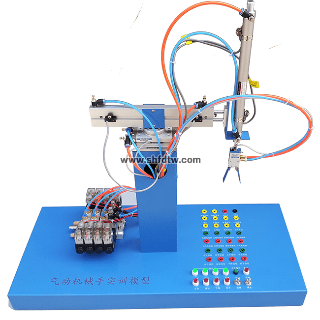 本實訓模型是一套完整的氣動機械手搬運裝置,由安裝底板、氣動手指、單桿提升氣缸、雙導桿伸縮氣缸、旋轉擺動氣缸、多種類型磁性傳感器、多種類型電磁閥、空氣過濾器、氣源控制滑閥及接線端子排等組成。主要完成物料的搬運功能,氣動機械手通過前臂下降,氣動手指夾緊物體,手臂縮回,手臂右擺,手臂前伸,前臂下降,手爪松開將物體放到指定位置等動作后,機械手返回原位。將電磁閥及磁性開關等元件的引出線連接到相應的端子接線排上,方便使用。能滿足職業(yè)院??删幊炭刂破?、機電一體化、氣動技術等相關課程的實訓教學??刂齐娫矗篋C 24V