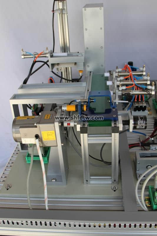 主要由傳送帶、變頻器、三相交流減速電機(jī)、旋轉(zhuǎn)氣缸、磁性開關(guān)、電磁閥、調(diào)壓過濾器、光電傳感器、光纖傳感器、對(duì)射傳感器、計(jì)數(shù)器、支架、機(jī)械零部件構(gòu)成。