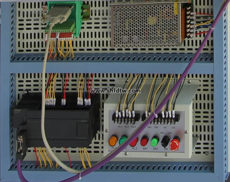 3、按鈕模塊:開關(guān)電源24V/6A,急停按鈕1只,轉(zhuǎn)換開關(guān)2只,蜂鳴器1只,復(fù)位按鈕黃、綠、紅各1只,自鎖按鈕黃、綠、紅各1只,24V指示燈黃、綠、紅各2只;