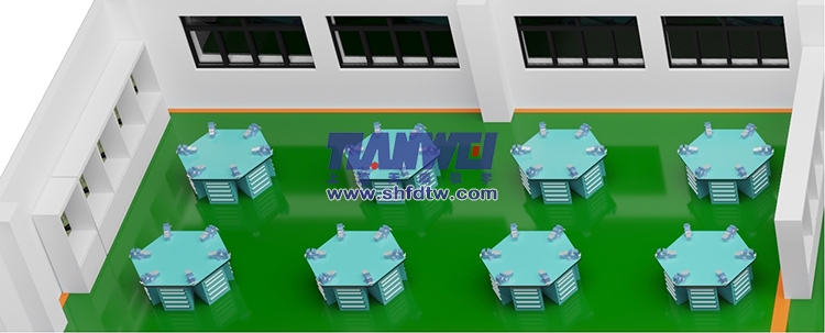 尺寸:每個(gè)工位邊長(zhǎng)為1000mm,臺(tái)面采用50mm厚的高密度板桌面; 外包1.5mm不銹鋼板。
