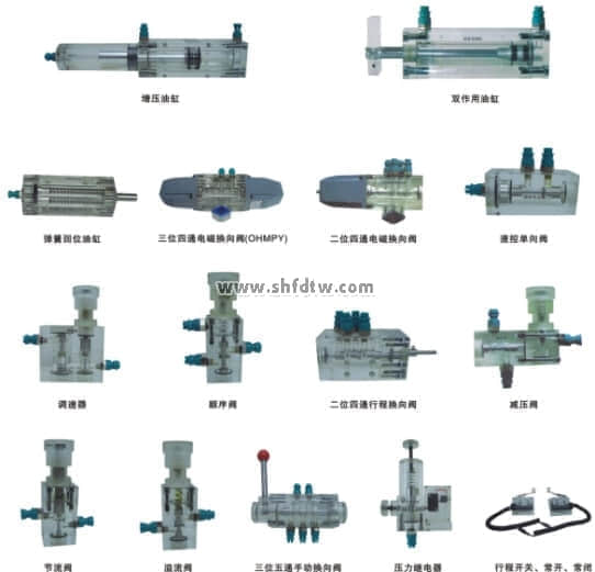 4、實訓(xùn)元件均為透明有機材料制成,便于了解掌握幾十種常用液壓元件的結(jié)構(gòu),性能及用途。掌握幾十種基本回路的工作原理,實驗組裝回路快捷、方便。