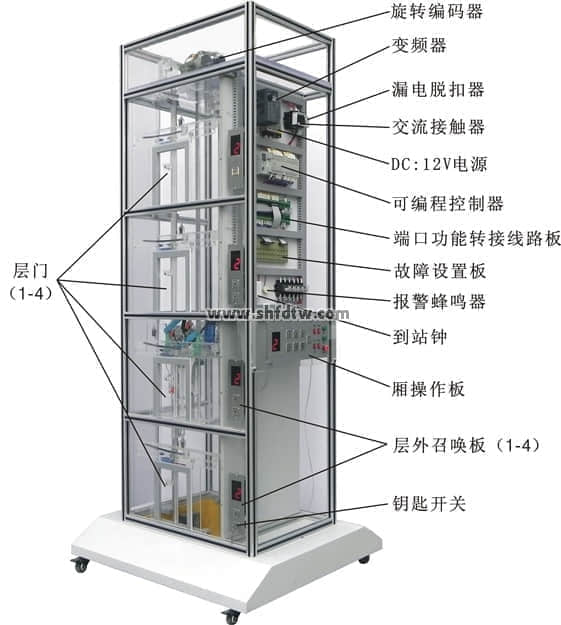 電梯是根據(jù)常見(jiàn)的升降式電梯結(jié)構(gòu),采用透明有機(jī)材料制成,其結(jié)構(gòu)與實(shí)際電梯完全相同,且?guī)缀蹙邆淞藢?shí)際電梯的所有功能。事實(shí)上可以把它看作是小型化了的真實(shí)電梯。為了便于教學(xué),電梯大部分部件均是采用透明有機(jī)材料制成,使得電梯的內(nèi)部結(jié)構(gòu)一目了然;同時(shí),電梯的運(yùn)行過(guò)程,以及每個(gè)動(dòng)作都十分明了,且可以反復(fù)實(shí)際動(dòng)手操作。使學(xué)生能夠很直觀、透徹地了解、掌握電梯的結(jié)構(gòu)及其動(dòng)作原理,達(dá)到事半功倍的效果。解決了以往電梯教學(xué)中單純的理論教學(xué)方式或是參觀實(shí)際電梯時(shí)所帶來(lái)的不安全,無(wú)法全面了解其內(nèi)部結(jié)構(gòu)及運(yùn)行過(guò)程等種種實(shí)際問(wèn)題。