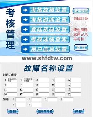 1)該系統(tǒng)由安卓藍(lán)牙的故障設(shè)置系統(tǒng)和觸摸屏的故障考核系統(tǒng)兩部分組成。教師在講課時(shí),用帶安卓系統(tǒng)的手機(jī)或平板電腦遠(yuǎn)程無線設(shè)置故障,遠(yuǎn)程啟動(dòng)、停止教學(xué)設(shè)備,方便教師教學(xué)講課。學(xué)生考核是在觸摸屏故障考核系統(tǒng)上完成的。教師和學(xué)生界面分開,教師輸入密碼進(jìn)入教師界面出題并設(shè)置考試時(shí)間啟用后,學(xué)生才能開始考核。教師界面故障類型為斷路故障、虛接故障、短路故障三種,教師可任意出題,設(shè)置故障后,屏幕上按鈕會(huì)由綠色變?yōu)榧t色,同時(shí)繼電器板動(dòng)作,設(shè)備產(chǎn)生故障。學(xué)生在答題界面會(huì)顯示學(xué)號(hào)、剩余時(shí)間、故障總數(shù),學(xué)生在設(shè)備上檢測(cè)查出故障后,選擇相應(yīng)的故障按鈕,屏幕上按鈕會(huì)由紅色變綠色,故障選擇完畢后,點(diǎn)擊提交試卷后,就會(huì)看到本次考試成績(jī)。